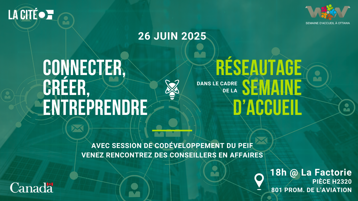 Collège La Cité 801 Aviation Parkway, Ottawa, ON, CanadaVous cherchez à lancer ou développer votre projet entrepreneurial? Participez à une soirée dynamique de codéveloppement et de réseautage, le 26 juin à La Factorie au Collège La Cité! Venez rencontrer des conseillers en [...]
