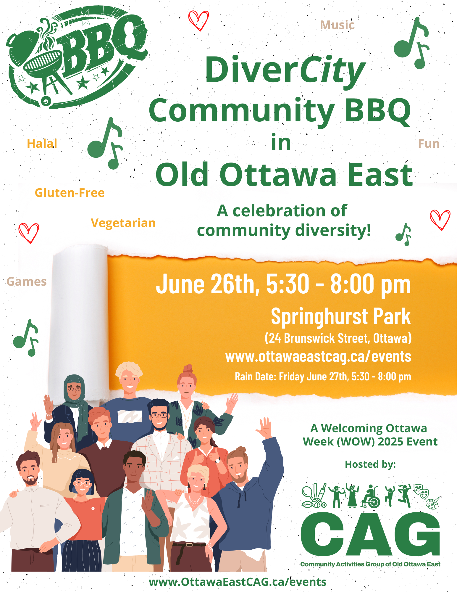 Springhurst Park 24 Brunswick St, OttawaLe Groupe d'activités communautaires d'Ottawa-Est (GACE) organise un barbecue communautaire DiverCITY ouvert à tous au parc Springhurst le jeudi 26 juin de 17h30 à 20h (en cas de pluie, l'événement sera reporté au vendredi [...]